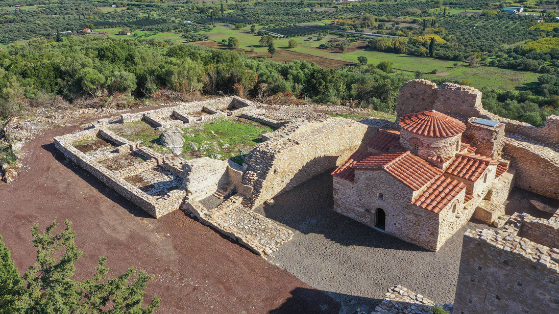 Περιμετρικά του ναού σώζονται τα κατάλοιπα ενός μικρού φράγκικου κάστρου, το οποίο ταυτίζεται με το αναφερόμενο στις πηγές κάστρο του Αρχαγγέλου και έχει υποστεί πλειάδα μετασκευών και επεμβάσεων κατά τη μακραίωνη ιστορία του. Το μικρό κάστρο έχει τετράπλευρο σχήμα, διαστάσεων 22×26μ. περίπου και φαίνεται ότι ενισχυόταν στις γωνίες του με μεγάλες πυργόσχημες προεξοχές. Καλύτερα διατηρείται σήμερα μόνο αυτή στη νοτιοδυτική γωνία του κάστρου, η οποία αρχικά ήταν ανοικτή προς το εσωτερικό. Σε μεταγενέστερη περίοδο, αμέσως μετά τα Ορλωφικά, μετασκευάστηκε σε κανονικό πύργο, όπως επιβεβαιώνεται από την εγχάρακτη χρονολογία 1778 στο τόξο της υπερυψωμένης εισόδου στο μέσο της βόρειας πλευράς. Κατάλοιπα ενός συγκροτήματος ξυλόστεγων κτισμάτων οργανωμένων γύρω από μια περίκλειστη αυλή σώζονται στα βόρεια του περιβόλου, τα οποία πιθανότατα αποτελούσαν τον βασικό χώρο διημέρευσης της μικρής μοναστικής κοινότητας για το διάστημα που το μνημείο λειτουργούσε ως μοναστήρι, μετά τα τέλη του 18ου αιώνα έως το 1940, οπότε και εγκαταλείφθηκε οριστικά.